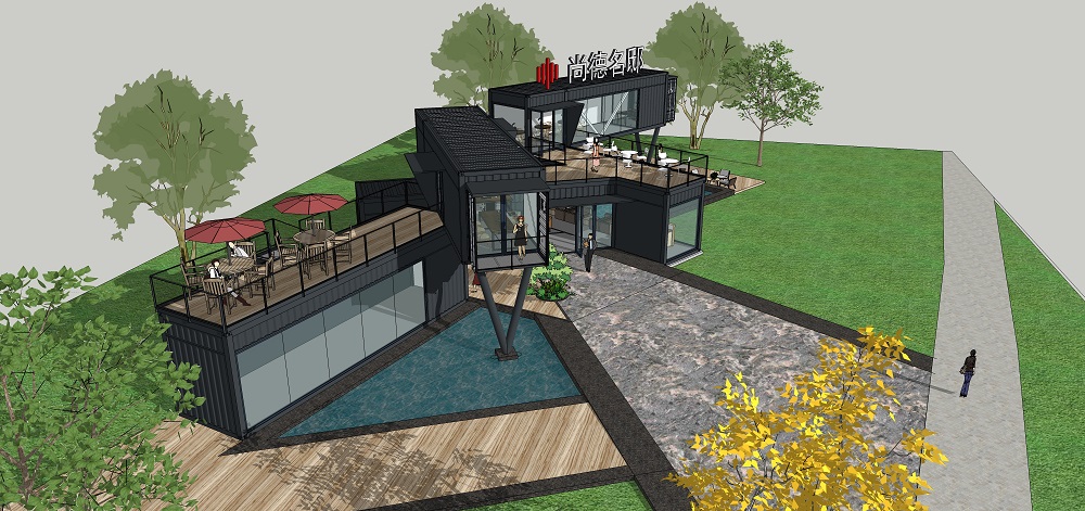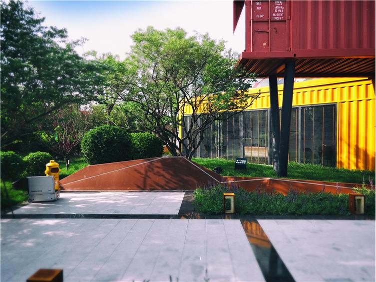新壹街的售楼处受众对象主要为年轻人。针对项目受众人群,设计提出集装箱建筑形式结合景观场外的概念。