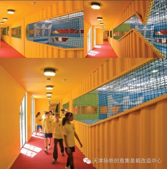 透明玻璃和“温室”的设计,以及长廊内部的洞口使室内空间充满自然光。这也令空间适合考试、集会和其他活动。透过玻璃窗可以从室外瞥见体育馆内的活动,将建筑与其室外环境联系起来——这是砖盒子似的集装箱体育馆所缺乏的东西。晚上,集装箱体育馆可提供体育设施或多功能厅供社区使用,建筑上的洞口使得临街立面光芒四射,当内外两层窗户的轮廓被照亮时,建筑显得更加活灵活现。
