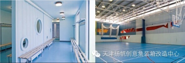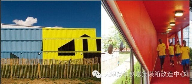 海运集装箱作为建筑结构和内部环境,创造出一个非常简单且符合成本效益的建筑,并且激发出参与体育的兴奋感。集装箱体育馆四角的集装箱被漆成四原色,使建筑看起来像是四个小建筑物挤在一起形成的。体育馆的工业化形象被巨大的窗洞口削弱,更像是大型温室。设计旨在整合集装箱体育馆的工业美学和郊区环境。