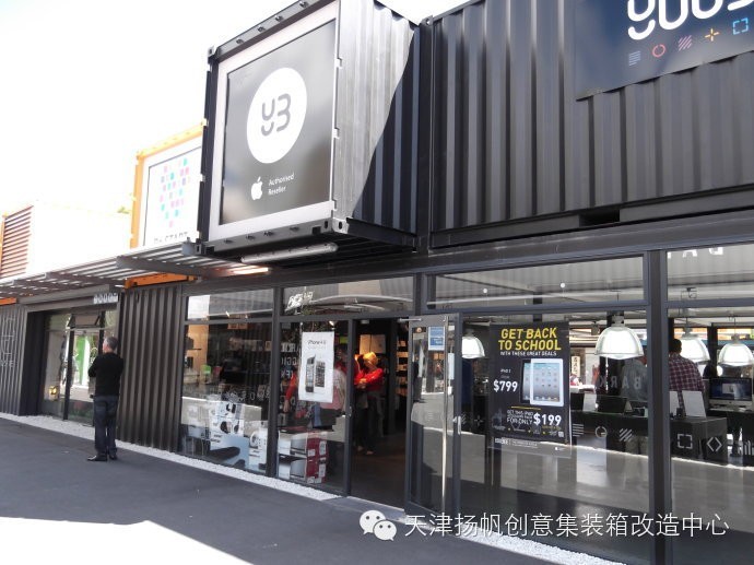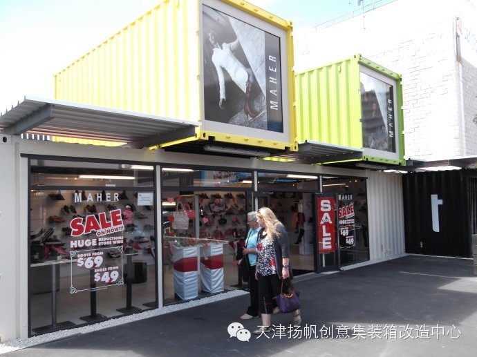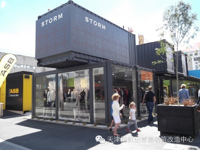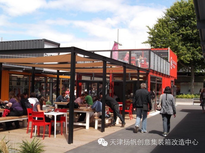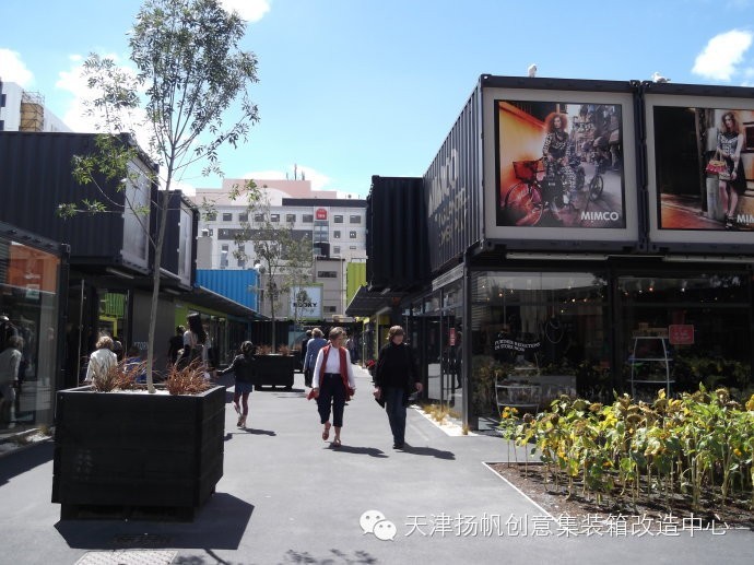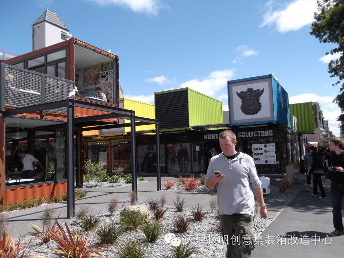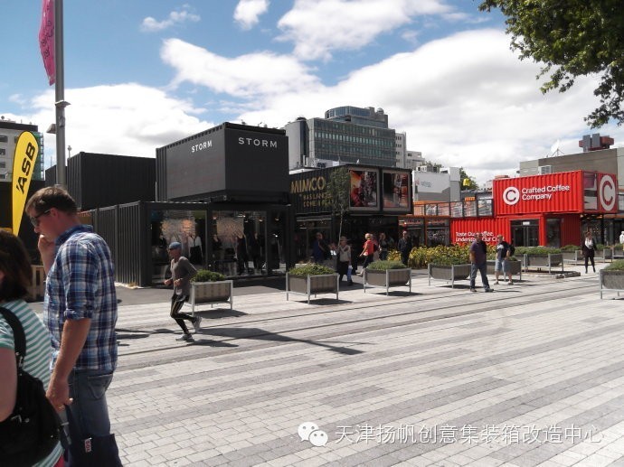 新西兰的基督城在地震之后利用集装箱的框架性和抗震性,在Start的商业广场使用60多个海运集装箱作为27家店铺搭建了零售点,这样的创新性建筑商业街,以一种现代艺术的形式,重新演绎商业文化。在Start集装箱商业广场,有咖啡店、名牌服装店、小饰物店,甚至还有银行和苹果专卖店。