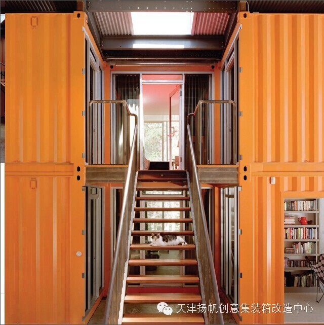 一个坡度平缓的金属屋顶连接着橙色的两翼,分别由6个集装箱组成,两翼之间形成了一个壮观的全玻璃的挑高起居空间
