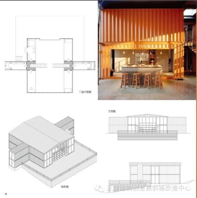 12个橙色集装箱置于混凝土基础之上。两层集装箱组成了两个字母 T 的形状,两组远离的集装箱中间形成了一片很大的玻璃空间。这座对称式房子中央的双层挑空空间里,设有宽敞的客厅、餐厅和两个直达楼上的楼梯。每个楼梯分别通往房子的 T 字两翼。一层是厨房、图书室、办公室和主卧。由于中央的落地玻璃和集装箱短边的玻璃窗,整栋住宅非常明亮。室内集装箱上的玻璃洞口使家庭成员间有很好的视线交流。虽然集装箱外侧的长边作为墙体,面向室内的长边却被部分移除,这样室内空间更加流动,并且与中央开敞空间具有更好的联系。楼上的功能更加私密,设置了浴室、卧室和办公室。住宅面向大海的一侧有一个很大的带室外壁炉的露台。